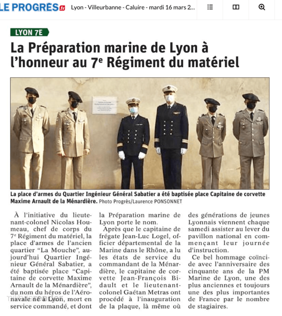 La PMM de Lyon et particulièrement son parrain, le CC Maxime Arnault de la Ménardière ont été mis à l’honneur à l’occasion d’une cérémonie ce vendredi 12 mars 2021. En effet, la place d’armes utilisée par la PMM de Lyon a été baptisée du nom de ce prestigieux pilote de l’aéronautique navale, résistant et mort en service commandé.