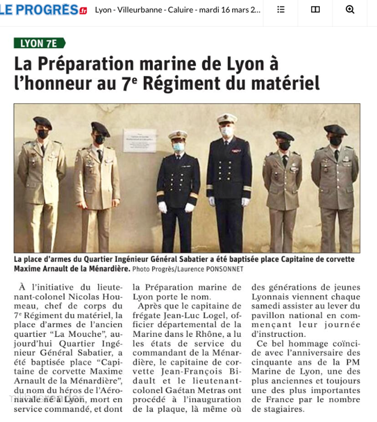 La PMM de Lyon et particulièrement son parrain, le CC Maxime Arnault de la Ménardière ont été mis à l’honneur à l’occasion d’une cérémonie ce vendredi 12 mars 2021. En effet, la place d’armes utilisée par la PMM de Lyon a été baptisée du nom de ce prestigieux pilote de l’aéronautique navale, résistant et mort en service commandé.